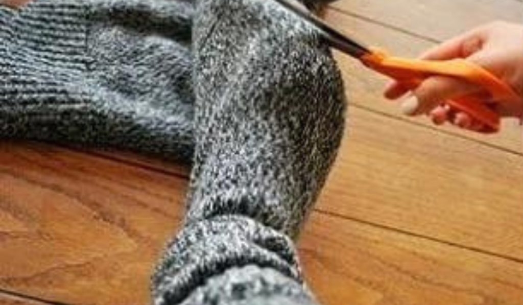 4. Húzzuk fel a lábunkra a pulóver ujját, ezután vágjuk le úgy, hogy éppen a talpunkig érjen.